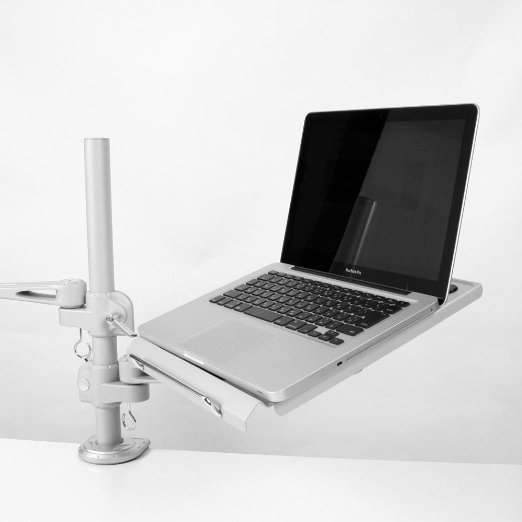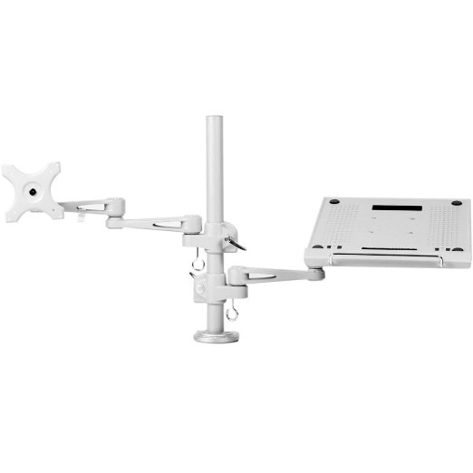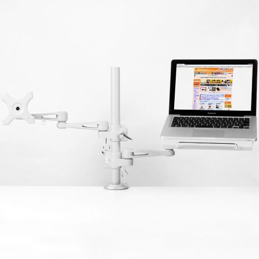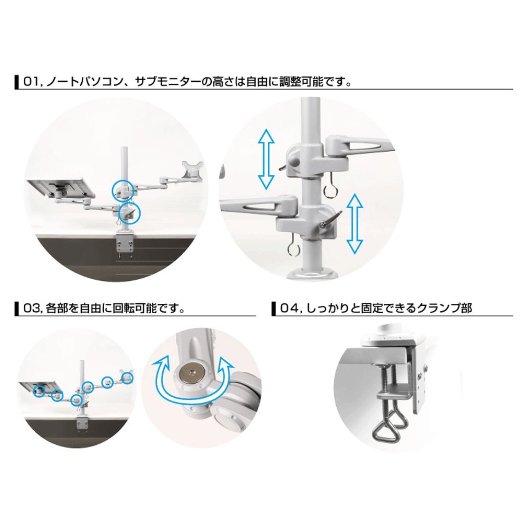 [パソコンデスク/ラック]ノートパソコンとサブモニタを一緒に搭載可能なアームです。 ◆ ノートパソコン台と27インチモニタを搭載できるモニターアームです。本製品を使用することでノートパソコンをデスクの上に置く必要が無くスペースを広く使うことが可能になります。またアームの留め部は分かれている為、ノートパソコンと液晶モニターの高さをそれぞれ調整することができます。