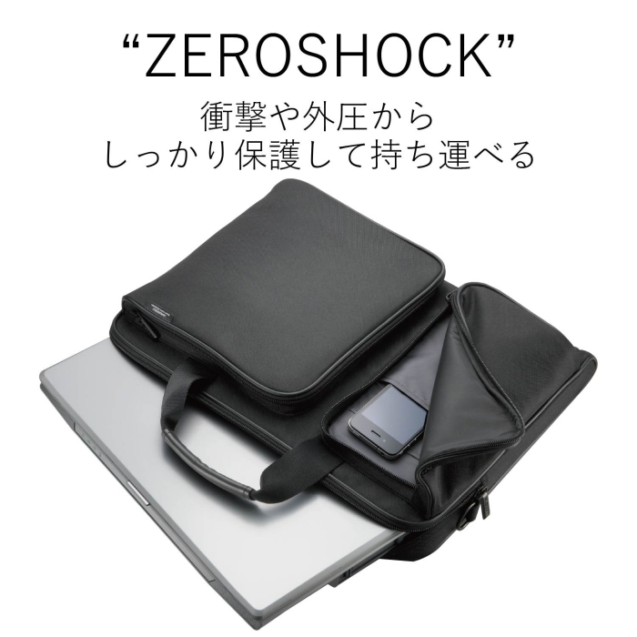 ※[キャリングバッグ/ケース]前面ポケットも低反発ポリウレタン素材採用で超衝撃吸収! ◆ 抜群の衝撃吸収力を持つ低反発ポリウレタンを使用した「ZEROSHOCK」シリーズのキャリングバッグです。16.4インチまでのノートパソコンを収納可能です。ノートパソコン収容部のクッション材に低反発ポリウレタンを使用し、大切なノートパソコンを守ります。◆前面ポケットも低反発ポリウレタン素材採用で超衝撃吸収! ノートパソコンだけでなく、スマートフォンなどのモバイル機器も衝撃から守る、スリムタイプのZEROSHOCKキャリングバッグ。 バッグタイプ : ブリーフタイプ 材質 : ポリエステル 内寸 : 幅385mm×奥行45mm×高さ300mm 、PC収納部内寸 : 幅385mm×奥行45mm×高さ300mm ポケット : 前面 : ファスナーポケット(アクセサリーポケット×2)、ファスナーポケット