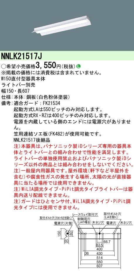 ※・本体 鋼板(白色粉体塗装) ・天井直付型適合ガード FK21534 ・起動方式LAは550ピッチのみ対応します。 ・起動方式RX・RZは400ピッチのみ対応します。 ・電源を内蔵している側のエンドには電源穴がありません。 ・笠用連結ソエ板(FK482)が使用可能です。 ・注)本器具は、パナソニック製iDシリーズ専用の器具本体とライトバーとの組み合わせで性能を満足します。ライトバーの単独使用禁止およびパナソニック製iDシリーズ以外の商品とは組み合わせをしないでください。 ・注)一般屋内用器具です。屋外環境(軒下など半屋外を含む)や腐食性ガスの発生する場所、太陽の光が直接器具に当たる場所では使用できません。 ・注)WiLIA調光タイプ・PiPit調光タイプライトバーは器具内送り配線できません。 ・注)ガードはひとセンサ付、WiLIA調光タイプ・PiPit調光タイプには使用できません。