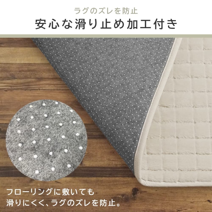 ラビットファーのようなストレートな立毛のラグです。ふわふわの心地よい肌触りです。グリッド調のラインがアクセントになります。消臭効果のあるウレタンを使用しています。裏面にすべり止めが付いているので、ラグがずれるのを防ぎます。床暖房、ホットカーペット対応です。洗濯はできません。●目付け(約):表地 420g/m2