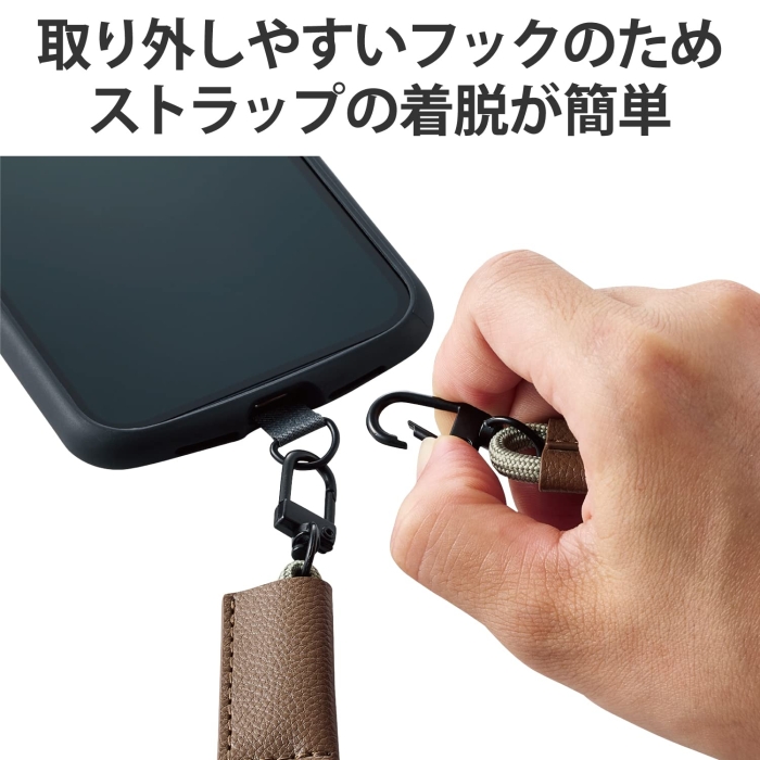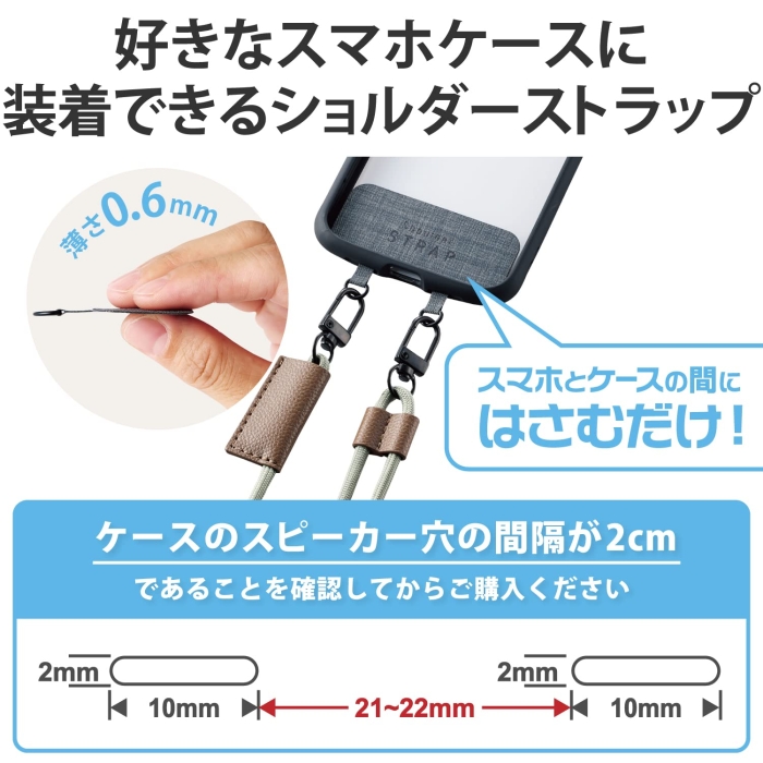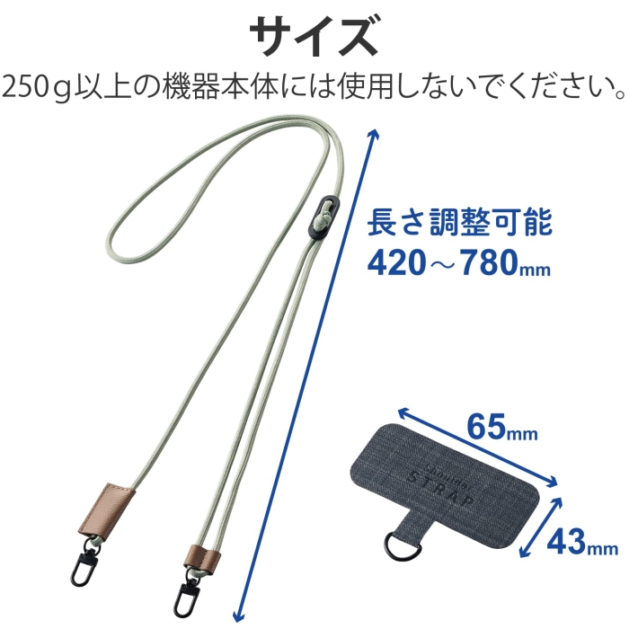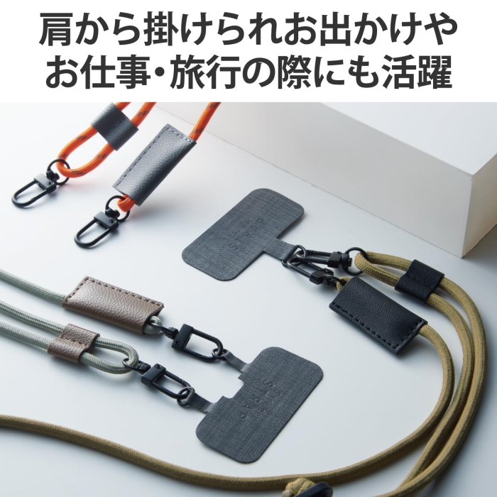 [エレコム][ストラップ類]■肩から掛けられ、バッグやポケットから取り出さなくてもすぐにスマートフォンの操作ができるショルダーストラップです。■両手があいて、普段のお出かけはもちろん、お仕事や旅行などのイベント時にも活躍します。■落下、盗難、紛失防止にもなります。■取り外しやすいフックを使用しているので、ストラップの着脱が簡単にできます。■ストラップは調節パーツでお好みの長さにできます。■耐久性の高い素材の丸ひもを採用しているので、カジュアルやアウトドアなどのアクティブな装いに合わせやすいデザインです。■ストラップの縫製部分はソフトレザー素材のパーツで保護して強度を高めています。■ケースにストラップホールがなくても、付属のストラップシートをスマートフォンとケースの間に挟むだけで使用でき、取り外しも簡単です。■セット内容:ショルダーストラップ、ストラップシート(1口/2口)各1枚■サイズ:ショルダーストラップ:全長約420〜780mm、ストラップシート:W65mmxD0.6mmxH43mm■材質:ポリエステル、亜鉛合金、合成皮革、PP■カラー:オリーブ■耐荷重:2.5kgまで※250g以上の機器本体には使用しないでください。 ◆ 肩から掛けられ、バッグやポケットから取り出さなくてもすぐにスマートフォンの操作ができるショルダーストラップです。