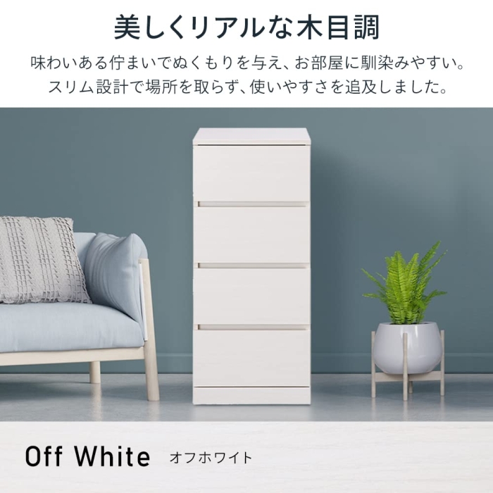 シンプルなデザインの木製チェストです。引き出しは4段です。置く場所を選ばない幅約40cmのスリムタイプです。引き出しには開閉がスムーズな金属レールを使用しています。引き出しの裏面には底抜け防止の補強板を付けることで、しっかり支えることができます。背板には横揺れを防止する背板止め付きです。お客様組み立てとなります。組み立てパーツに番号シール付きです。●耐荷重(約):全体22kg、天板10kg、引き出し1個あたり3kg●引き出し内寸(約):307×336×115mm●収納の目安(引き出し1段あたり):Yシャツなら4枚・バスタオルなら4枚・タオルなら5枚