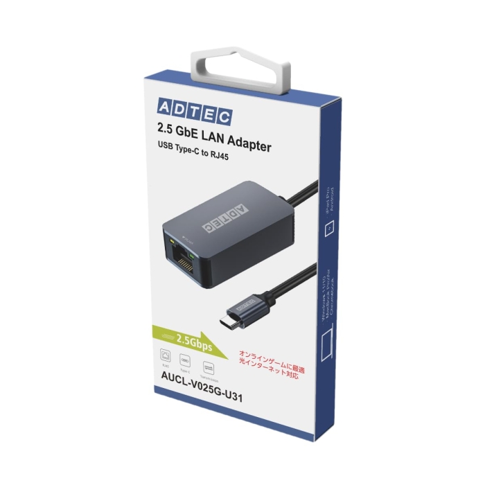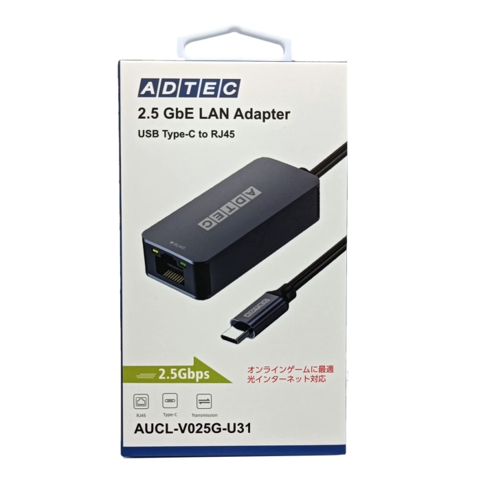 [アドテック][LANインターフェイス]Type-C接続で光回線などに対応した高速2.5Gbps通信対応イーサネットアダプタ。 ◆ [入力端子]USB3.2 Gen1 / 3.1 Gen1 / 3.0 / 2.0 / 1.1/ Type-Cコネクタ オス [有線LANコネクタ]RJ-45(Auto MDI/MDI-X)×1ポート、Auto-Negotiation対応 [有線伝送速度(理論値)]2.5Gbps/1000Mbps/100Mbps/10Mbps(理論値) [アクセス方式]CSMA/CD [LAN電源電圧]5V (USB バスパワーによる供給)