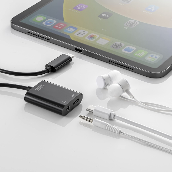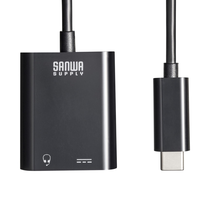 [サンワサプライ][ヘッドホン/イヤホン]イヤホン端子のないスマホやタブレット(TypeC仕様)でΦ3.5mmプラグのマイク付きイヤホンが使える。 ◆ スマホやタブレットのUSB Type-Cポートに3.5mmプラグ仕様のイヤホンやヘッドセットが接続できる変換アダプタです。両端に充電用USB Type-Cポートと音楽再生用3.5mmジャックを搭載し、本体を充電しながら音楽鑑賞や通話が可能です。USB PD対応の充電器を使用すれば、最大60Wの急速充電が可能です。(機器本体もUSB PD充電対応の場合)最大24bit/96KHzに対応したDAC搭載で音楽や映画を高音質で楽しめます。