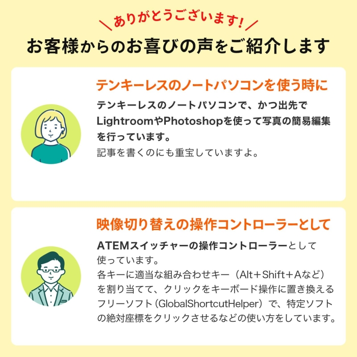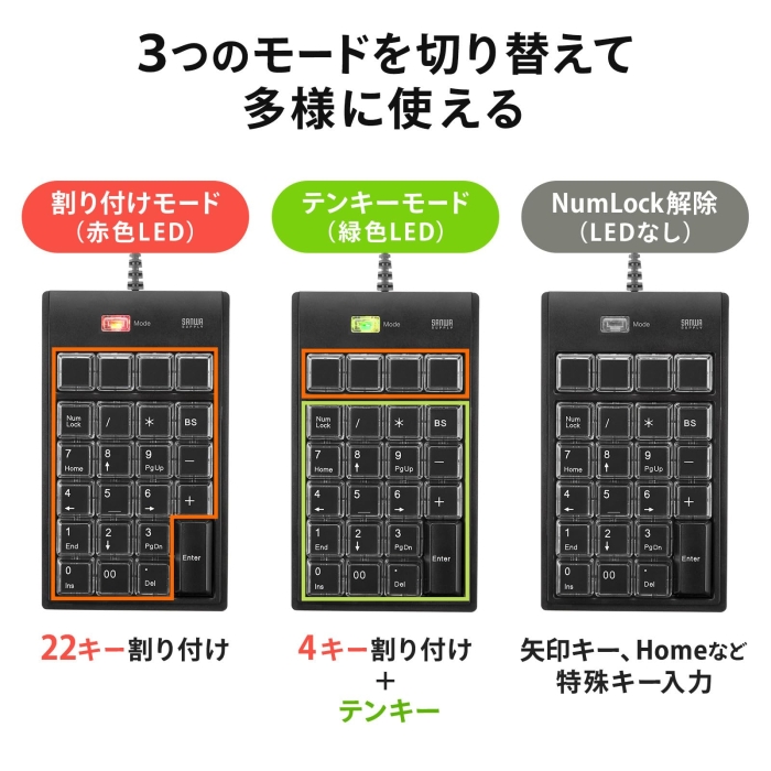 [サンワサプライ][キーボード]キーボードの機能が割付可能なテンキー ◆ 専用ソフトでスタンダード日本語109キーボードの機能を割り付けることができます。モードを切り替えることにより、4つの割り付け専用キー以外にも、Enterキー以外のすべてのキーに割り付けが可能です。割り付けた機能はテンキーのメモリーに記憶されているので、一度設定すればドライバの入っていないパソコンでも同じ機能が使えます。キートップのカバーが外れるので、割り付けた文字のシールなどを貼ることができます。※シールは同梱していません。デスクトップキーボードと同じ19mmキーピッチを採用しています。