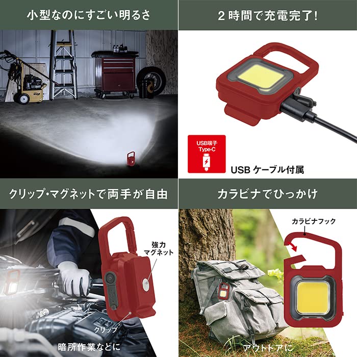 ※●手のひらサイズの本体から投光器のような強力な光を放ちます。●防水仕様[保護等級IP65]で雨や埃に強いタフ仕様。●明るさは3段階に切り替え可能。フラッシュ(点滅)機能も搭載しています。●充電式(USB TypeC)で電池交換は不要。繰り返し使用できます。ある強力マグネットとクリップ。カラビナフックであらゆるシーンでお使いいただけます。