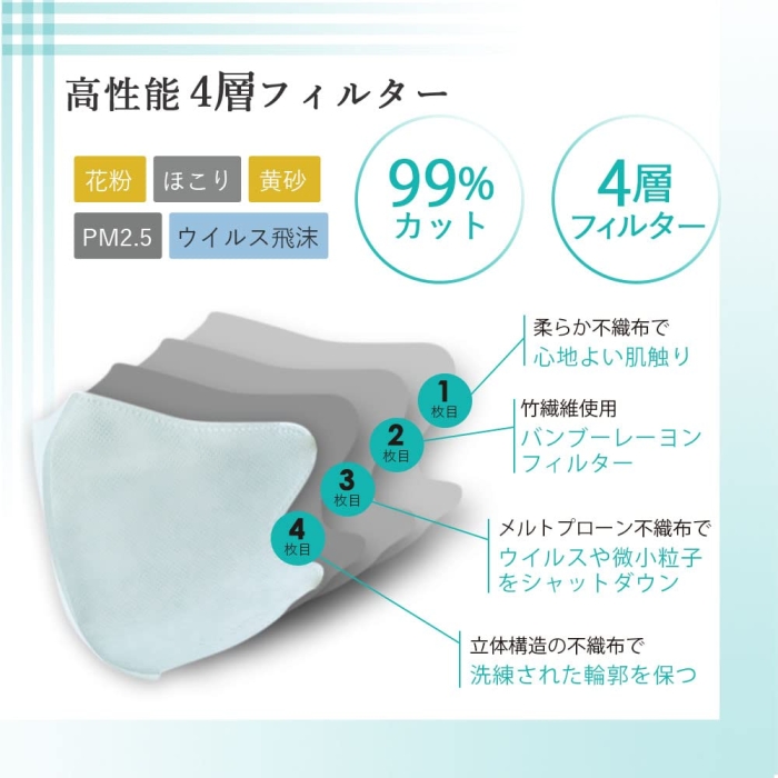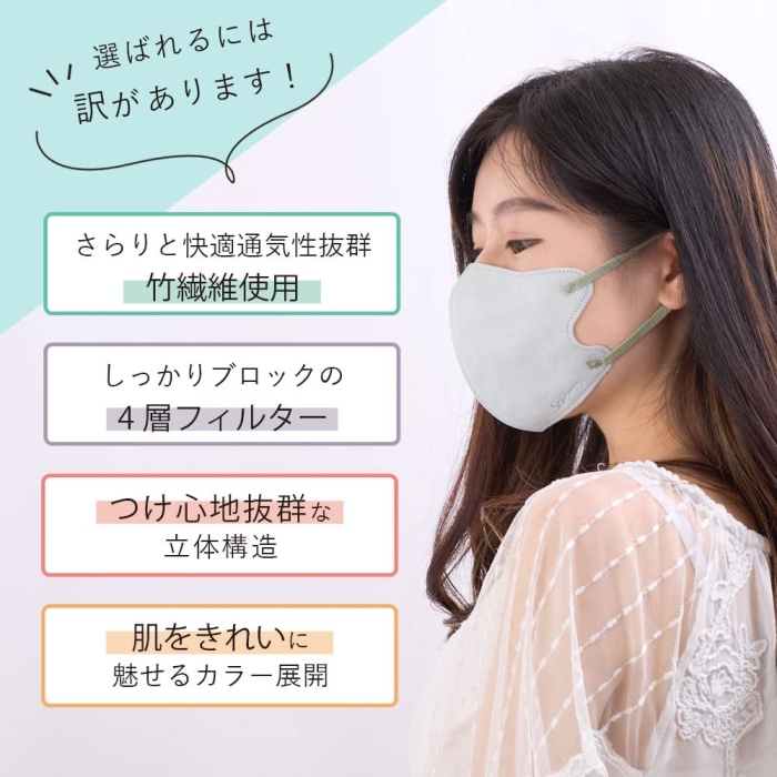 気分に合わせて選べるアクセントカラーマスク! ●ホワイト×オリーブ、ホワイト×ネイビー、ホワイト×グレーのアクセントカラーマスクです。●気分に合わせて選べる3色セット。毎日使える30枚入です。●耳が痛くなりにくいソフトゴム6mmを採用しています。●BFE、VFE、PFE 99%カット。高性能4層フィルターでしっかりブロックします。●単品サイズ 横144mm×110mm。男性もつけられるやや大きめサイズです。●竹繊維でさらりと快適、息がしやすいです。※メーカーの都合により、パッケージ・仕様等は予告なく変更になる場合がございます。 本体サイズ:144mm×110mm 内容量:30枚 表地・裏地:ポリプロピレンフィルター:レーヨン、ポリプロピレン耳ひも部:ポリエステル、ポリウレタン