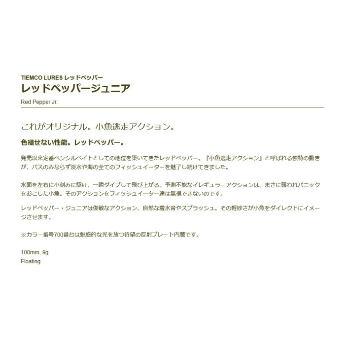 ECJOY!では ティムコ レッドペッパーJR 100mm 9g 272クリスタルシャート をはじめ、その他商品も取り揃えておりますので、あわせてご利用ください。