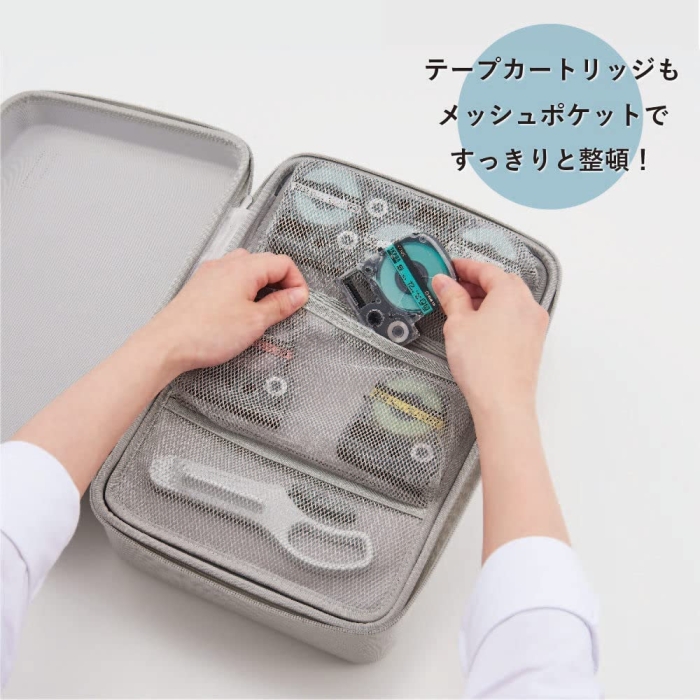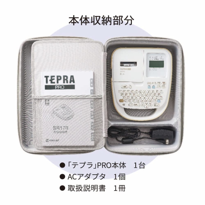 [その他文房具]「テプラ」本体と周辺用品がすっきりまとまる! ◆ 「テプラ」本体だけではなく、かさばりがちなテープカートリッジやトリマー、取扱説明書やACアダプタもまとめて収納できます。ケースはEVA製の丈夫なセミハード仕様で、傷や衝撃から本体をしっかり守ります。落ち着いたカラーとシンプルなデザインであらゆるシーンでお使いいただけます。