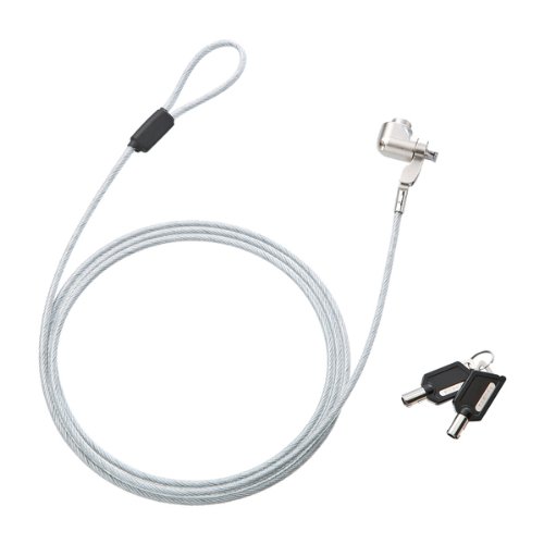 [サンワサプライ][防犯・防災用品]狭い場所でも脱着が容易なL字型シリンダの一体型セキュリティワイヤー。 ◆ シリンダ部がL字になっているので、取り付け機器の側面、裏面など狭い場所でも脱着が容易です。シリンダ部が小さいので、取付けても邪魔になりません。移動の多い方に最適な着脱簡単タイプです。