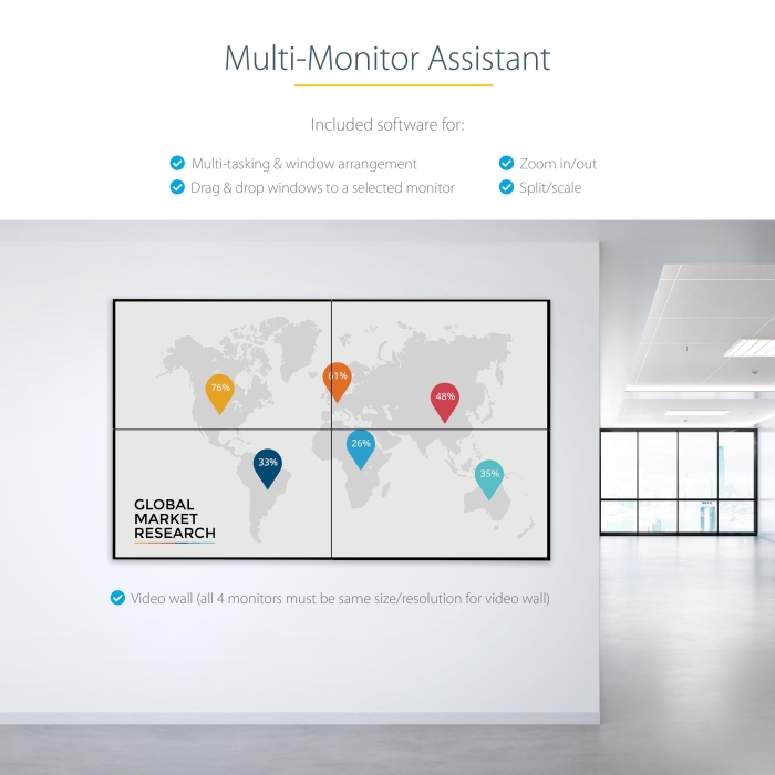 [ディスプレイアダプター]USB Type-Aポート1口を使用し、4台のHDMIディスプレイをノート/デスクトップPCに接続できるHDMI増設アダプタ ◆ ●クアッドモニタ対応:4台のHDMIディスプレイをノート/デスクトップPCに接続しデスクトップを拡張 ●作業効率の向上:ノートパソコンの画面も含め最大で5つのディスプレイで拡張モードをサポート | USBバスパワーの外付けビデオカードとして機能(外付け電源不要) ●マルチモニタアシスタント:効率的なマルチタスクとウィンドウ操作に便利なソフトウエア付き。選択したモニタへのドラッグ&ドロップ、ズームオプション、分割/スケーリングなどに対応。注意:ビデオウォール設定では同じサイズと解像度のモニタ4台が必要