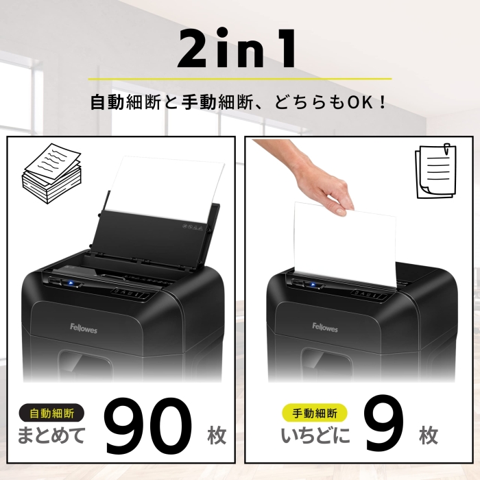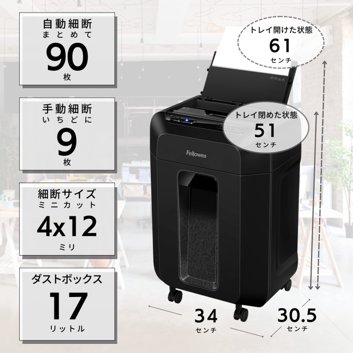 FELLOWS フェローズ 90M 4621801 電動シュレッダー 紙詰まり徹底対策 クロスカット 最大幅:A4 最大枚数:10枚以下 11L〜20L ホッチキス可 ブラック