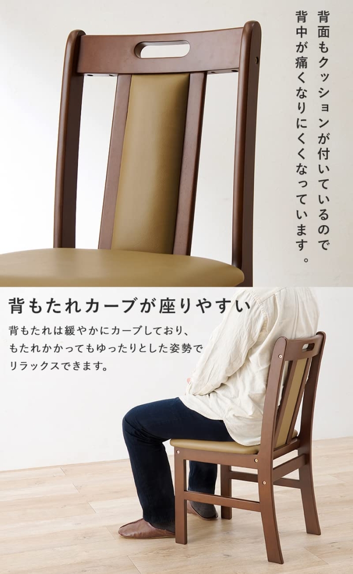 (約)幅43×奥行51×高さ80×座面高43cm ■組立式 主材:ラバ-ウッド、張地:合成皮革、座面:ウレタンフォーム 木の温かみが感じられるシンプルなダイニングチェア。座面クッションや取っ手など使いやすくなっています。