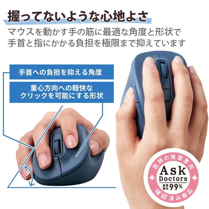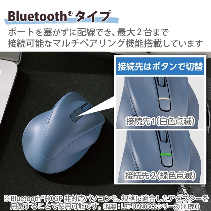 [エレコム][マウス/トラックボール]■医師との共同開発により究極の握り心地を実現した5ボタンマウス”EX-G”。■接続方式:Bluetooth無線■Bluetooth規格:Bluetooth 5.0 Class2■対応プロファイル:HOGP(HID Over GATT Profile)■対応機種:BluetoothHOGPに対応したWindows OS、Android、macOS、iOS、iPadOS、ChromeOS 搭載機■対応OS:Windows 11/10、Android 12、macOS Ventura 13、iOS 16、iPadOS 16、ChromeOS■通信方式:GFSK方式■電波周波数:2.4GHz帯■電波到達距離:最長約10m※ご使用環境により異なる場合があります。■接続先切替機能:対応(Bluetooth:2台)■読取り方式:BlueLED■センサー分解能:2000DPI■ボタン数:5個※ホイールボタン含む■ホイール数:1個■電源:単3形アルカリ乾電池、単3形マンガン乾電池、単3形ニッケル水素電池のいずれか1本■電池寿命:最長約16カ月(アルカリ乾電池使用時の目安)※ご使用状況により異なる場合があります。■サイズ分類:Lサイズ■外形寸法:幅約79mmx奥行約120mmx高さ約58mm■重量:約100g※電池含まず■内容物:マウス本体x1台、動作確認用単3形アルカリ乾電池x1本■カラー:ブルー■保証期間:2年間 ◆ 整形外科医との共同開発により自然な手の形のまま使える、握らないマウス“EX-G”シリーズ。