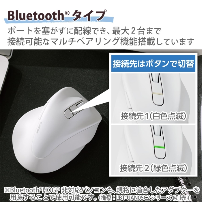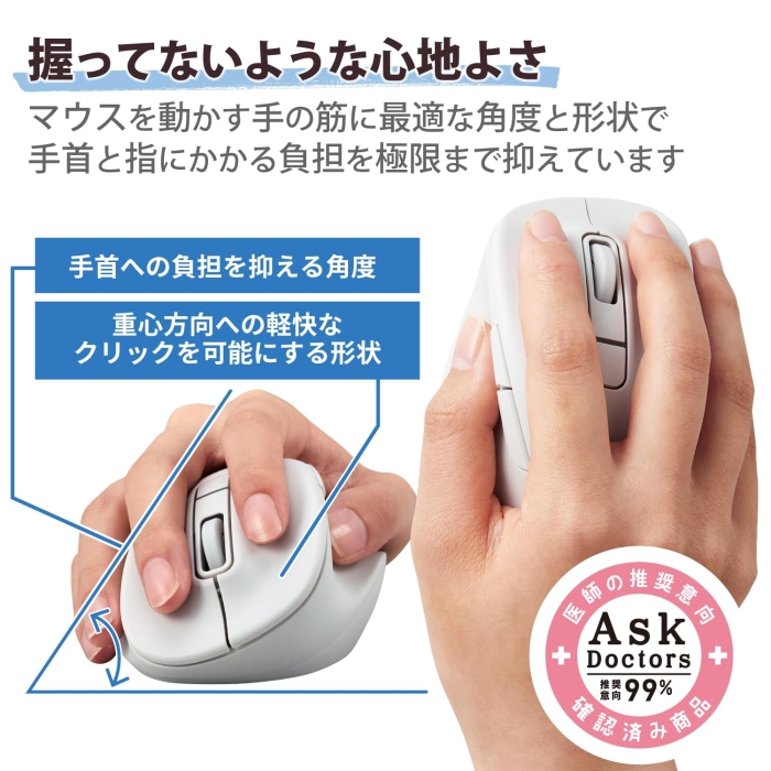 [エレコム][マウス/トラックボール]■医師との共同開発により究極の握り心地を実現した5ボタンマウス”EX-G”。■接続方式:Bluetooth無線■Bluetooth規格:Bluetooth 5.0 Class2■対応プロファイル:HOGP(HID Over GATT Profile)■対応機種:BluetoothHOGPに対応したWindows OS、Android、macOS、iOS、iPadOS、ChromeOS 搭載機■対応OS:Windows 11/10、Android 12、macOS Ventura 13、iOS 16、iPadOS 16、ChromeOS■通信方式:GFSK方式■電波周波数:2.4GHz帯■電波到達距離:最長約10m※ご使用環境により異なる場合があります。■接続先切替機能:対応(Bluetooth:2台)■読取り方式:BlueLED■センサー分解能:2000DPI■ボタン数:5個※ホイールボタン含む■ホイール数:1個■電源:単3形アルカリ乾電池、単3形マンガン乾電池、単3形ニッケル水素電池のいずれか1本■電池寿命:最長約16カ月(アルカリ乾電池使用時の目安)※ご使用状況により異なる場合があります。■サイズ分類:Lサイズ■外形寸法:幅約79mmx奥行約120mmx高さ約58mm■重量:約100g※電池含まず■内容物:マウス本体x1台、動作確認用単3形アルカリ乾電池x1本■カラー:ホワイト■保証期間:2年間 ◆ 整形外科医との共同開発により自然な手の形のまま使える、握らないマウス“EX-G”シリーズ。