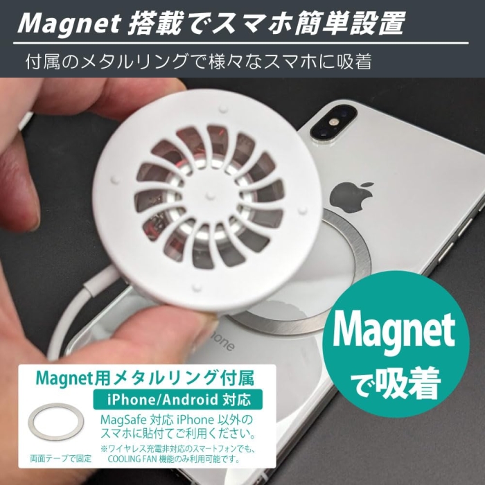 [その他モバイルアクセサリー/モバイル機器]マグネット内蔵スマホクーラー ブラック ◆ ◇マグネット内蔵スマホクーラー ブラック◇最大15W充電に対応(iPhoneは7.5W充電に対応します)※15W充電には別途PD充電器が必要になります◇9枚のフィンがスマホの熱をしっかり排出◇静音設計なのでFANの音が気にならない◇RGBイルミネーションに変化するLEDがGamiangにマッチ入力端子:Type-C入力:5V/2A(PD充電器使用時:9V/1.67A)出力:5V/2A(PD充電器使用時:15W)ケーブル長:約95cmカラー:ブラック