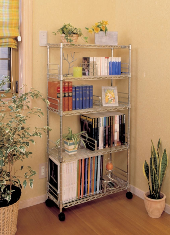 クロムメッキ仕上げのブックシェルフです。奥行きが約27.5cmなので、A4サイズのファイルがピッタリ収納できます。ブック用棚板1枚あたりに、固定式の落下防止用のガイドが2個、可動式の仕切り用ディバイダーが1個付いているので、収納物が落下しにくい形状になっています。棚の高さは自由に変えることができます。移動に便利なストッパー付きキャスター(4個の内2個)が付いています。●耐荷重(約):静止時;全体150kg、棚板1枚あたり75kg、移動時;全体100kg●ポール径(約):19mm