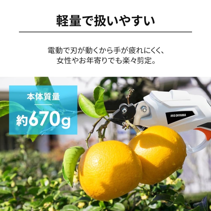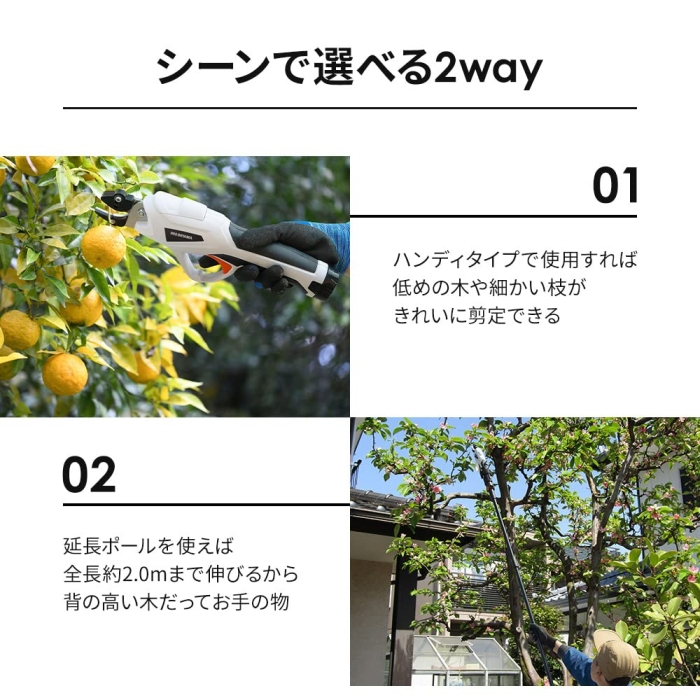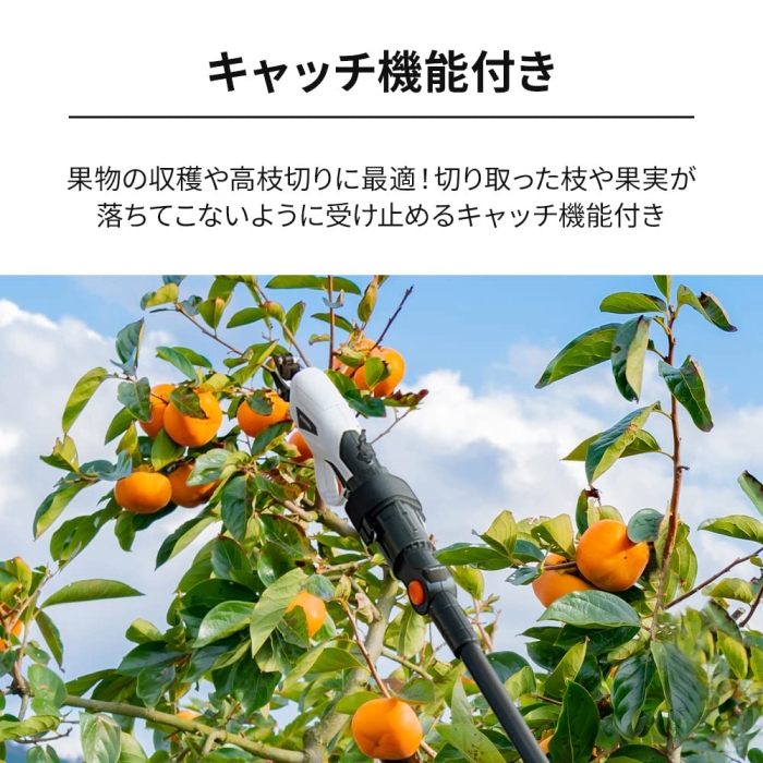 - 電動でラクラク剪定できる、女性や高齢者でも力を使わず剪定可能な充電式高枝剪定バサミです。高い場所の枝もカットできる延長ポール付きです。最長約2mまで調節可能です。本体のみでも延長ポールを付けても使える2WAYタイプです。延長ポールは、3段階のヘッド角度調整が可能です。刃先にキャッチ機能搭載、切った枝や果実をハサミで保持します(※保持できる果実の重量は枝の形状や実のつき方によって異なります)。過負荷保護機能・温度保護機能を搭載しています。ダブルロック機能によって誤作動を防止します。●商品サイズ(充電池含む)(約):本体:308×45×110mm、延長ポール装着時:1,990×67×110mm●商品重量(充電池含む)(約):本体:0.67kg、延長ポール装着時:1.35kg●連続使用回数(約):直径7mmの枝カット時:350回(※使用条件により変化します。)●最大剪定径:生木直径10mm●付属品:充電式リチウムイオン電池(DBL3715)1個、充電器(XH0600-0400WJ)1個、ブレードカバー1個●保証期間:お買い上げ日より1年間■充電池○種類:リチウムイオン二次電池○定格電圧:DC3.7V○容量:1500mAh○使用温度:0〜35°C(充電時:5〜35°C)■充電器○入力:AC100-240V、50/60Hz○出力:DC6V、400mA○充電時間(約):3〜5時間