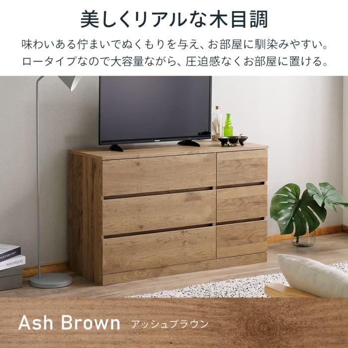 シンプルなデザインの木製チェストです。小引き出しが3段と大引き出しが3段のロータイプです。幅が広いので天板を利用してテレビ台としてもお使いいただけます。引き出しには開閉がスムーズな金属レールを使用しています。引き出しの裏面には底抜け防止の補強板を付けることで、しっかり支えたっぷり収納することができます。背板には横揺れを防止する背板止め付きです。お客様組み立てとなります。組み立てパーツに番号シール付きです。●耐荷重(約):全体44kg、天板20kg、引き出し(小)1個あたり3kg、引き出し(大)1個あたり5kg●引き出し内寸(約):(小)291×336×115mm、(大)640×336×115mm●収納の目安(引き出し1段あたり):(小)Yシャツなら4枚・バスタオルなら4枚・タオルなら6枚、(大)Yシャツなら6枚・バスタオルなら6枚・タオルなら12枚