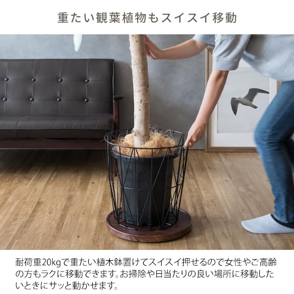 お部屋に飾っている観葉植物をお掃除のときや日当たりの良い場所に移動したいとき、重い鉢を持ち上げたり引きずることなくサッと動かせる便利なプランタースタンド『Treno(トレーノ)』。直径40cmと大きめサイズで、12号の鉢も置けます。隠しキャスターなので鉢皿と変わりなく見た目もスッキリ。360度回転で移動したい方向にスムーズに動かせます。カラーはお好みでお選びいただけるブラウンとナチュラル、ホワイトの3カラーをご用意。空気清浄機や加湿器、水や米びつなど重たいものも移動できるマルチスタンドとしても活躍してくれます。