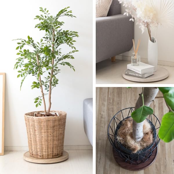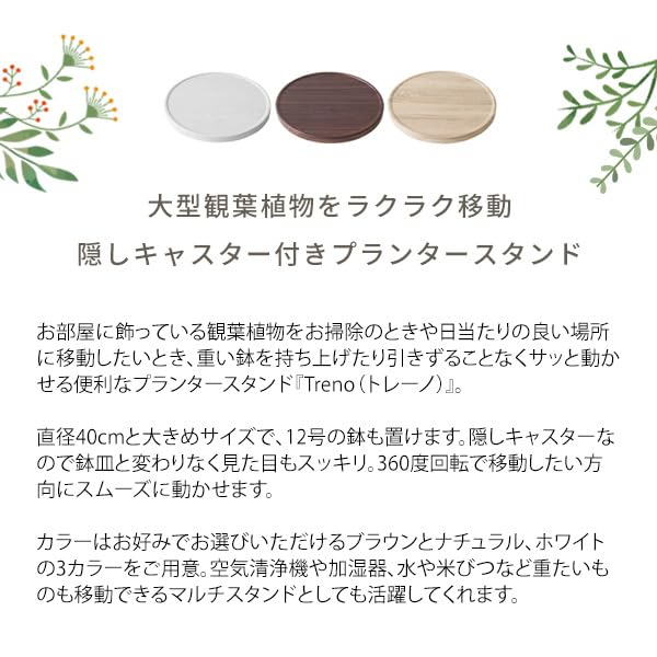 お部屋に飾っている観葉植物をお掃除のときや日当たりの良い場所に移動したいとき、重い鉢を持ち上げたり引きずることなくサッと動かせる便利なプランタースタンド『Treno(トレーノ)』。直径40cmと大きめサイズで、12号の鉢も置けます。隠しキャスターなので鉢皿と変わりなく見た目もスッキリ。360度回転で移動したい方向にスムーズに動かせます。カラーはお好みでお選びいただけるブラウンとナチュラル、ホワイトの3カラーをご用意。空気清浄機や加湿器、水や米びつなど重たいものも移動できるマルチスタンドとしても活躍してくれます。