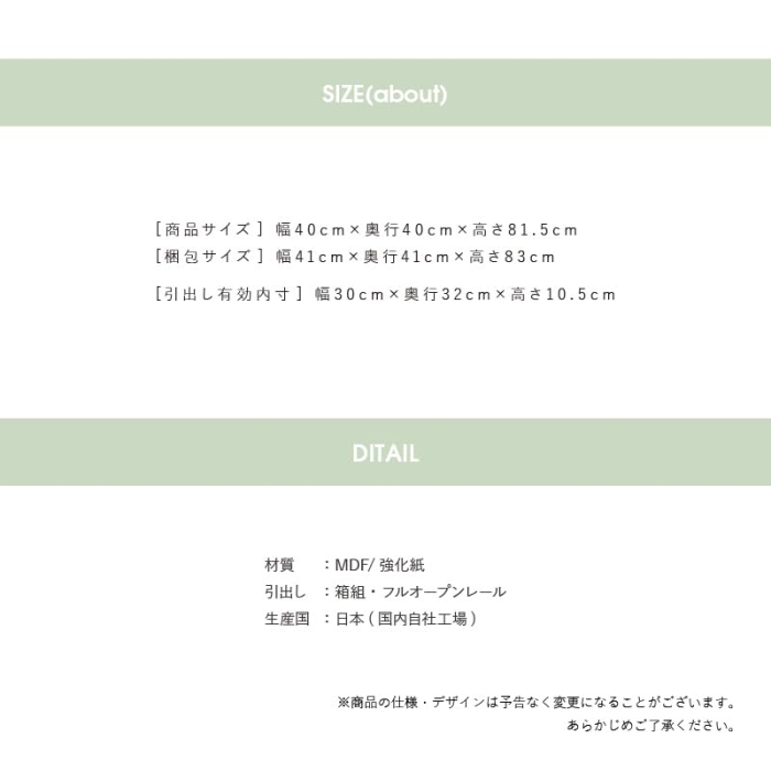 - 400×400×815 本体MDF/強化紙 フルオープンレール付 ◆ シンプルモダンなスリムチェスト