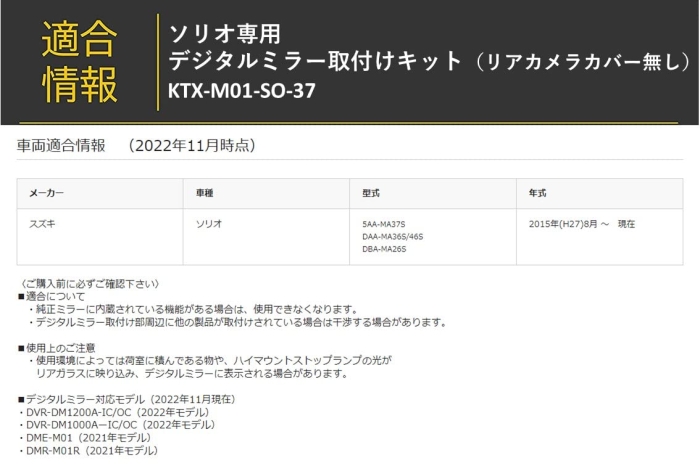 ECJOY!では デジタルミラー取り付けキット【KTX-M01-SO-37】 をはじめ、その他商品も取り揃えておりますので、あわせてご利用ください。