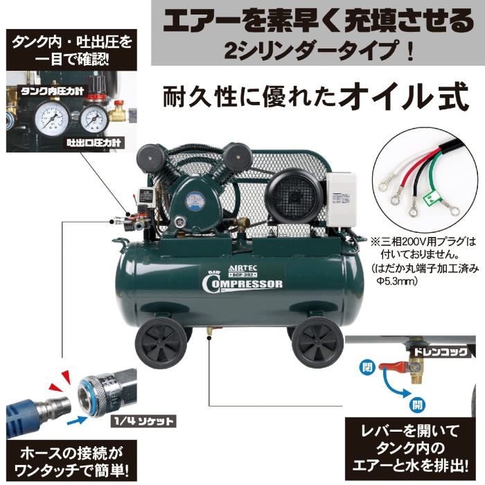 ナカトミ AIRTEC(エアーテック) 三相100Vエアーコンプレッサー(ベルト式)BCP-392