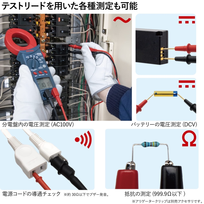 [チェッカー/テスター]●クランプ径:直径35mm。●リーク電流(0.01mA〜600mA)。●交流電流(0.01A〜400A)。●交流電圧(0.1V〜600V)。●直流電圧(0.1V〜600V)。●抵抗(0.1オメガ〜999.9オメガ)。●導通(30オメガ以下でブザー音:開放電圧0.9V)。●バックライト機能。●電圧、抵抗測定用テストリード付。●専用ケース付き。 ◆ ●リーククランプメータ。●リーク電流600mA。●交流電流400A、電圧600Vまで測定可能。●クランプ径:直径35mm。●バンドパスフィルター機能搭載。●電圧、抵抗測定用テストリード付。