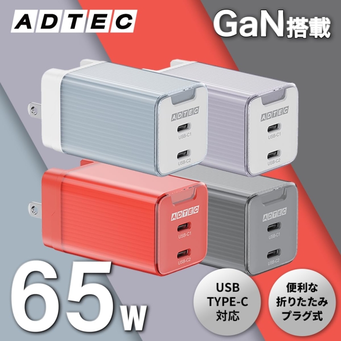 ADTEC アドテック Power Delivery対応 GaN AC充電器/65W/USB Type-C 2ポート/ブラック & Type-C to Cソフトケーブル(1m)セット【APD-V065C2-BK-SC10U2】