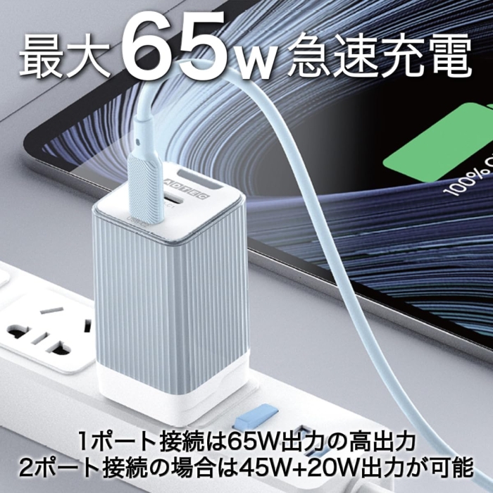 ECJOY!では Power Delivery対応 GaN AC充電器/65W/USB Type-C 2ポート/ブラック & Type-C to Cソフトケーブル(1m)セット【APD-V065C2-BK-SC10U2】 をはじめ、その他商品も取り揃えておりますので、あわせてご利用ください。