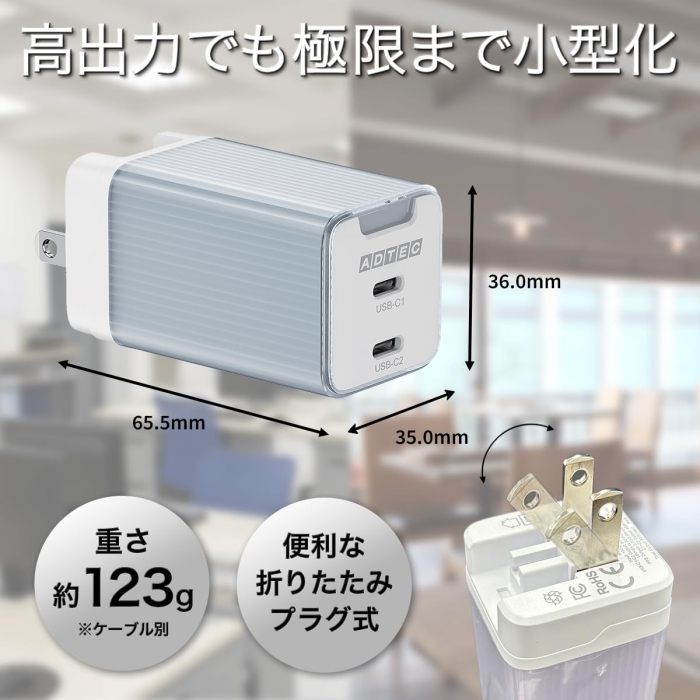 [アドテック][AC・その他充電器(モバイル)]USB-C 2ポート搭載。同時に2台の機器の充電に対応します。 ◆ [入力端子]AC100-240V 50/60Hz [使用温度範囲]0 〜 35°C