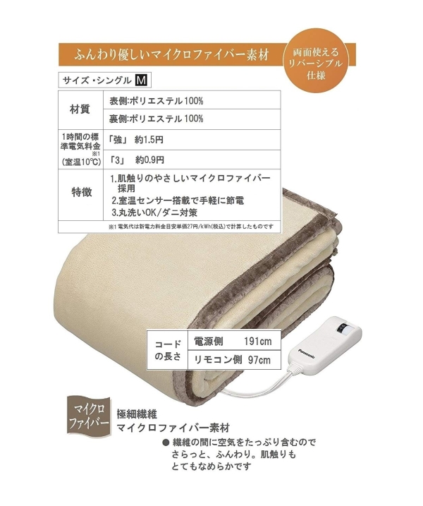 | メーカー | パナソニック | 商品名称 | 電気かけしき毛布(シングルMサイズ) | |||||