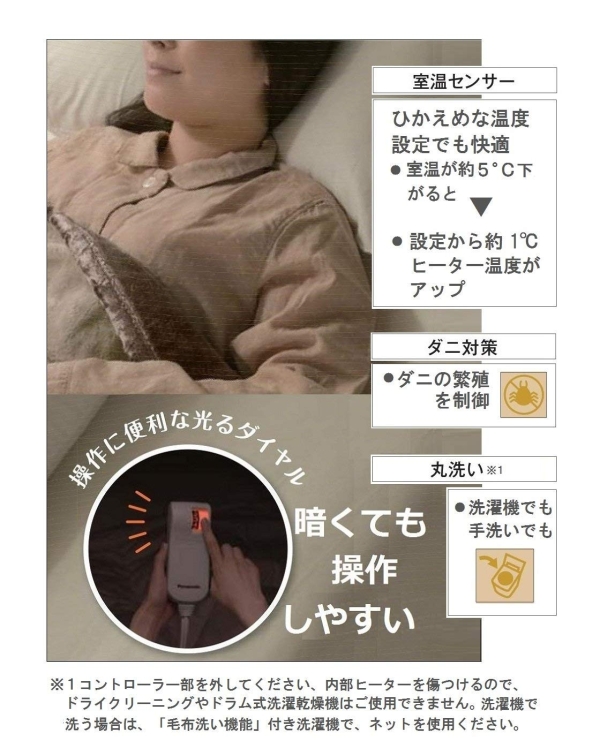 | 長文コメント1 | ■肌触りのやさしい、マイクロファイバー採用 ■室温センサー搭載で手軽に節電 ■丸洗いOK/ダニ対策 | |||||||