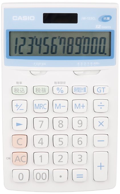 カシオ 抗菌電卓 JW-122CL-N税計算を搭載し清潔好きな方に抗菌加工された抗菌電卓。特大表示/税計算・時間計算機能/早打ち対応/12桁。デスクにピッタリ!操作性抜群のジャストタイプ。[外寸]176x107x25mm [質量]145g カラー]ホワイト