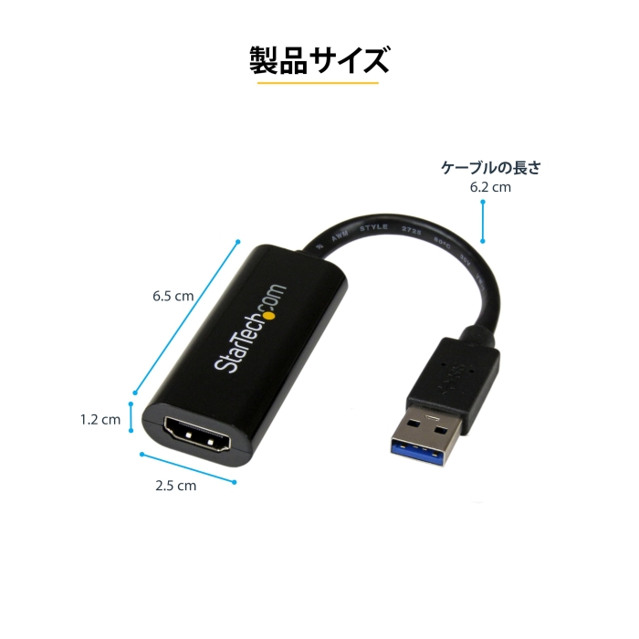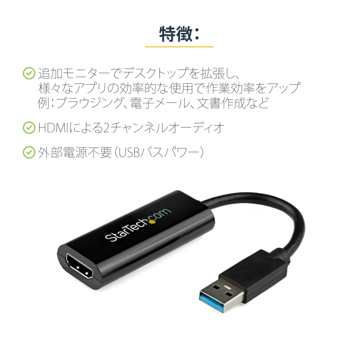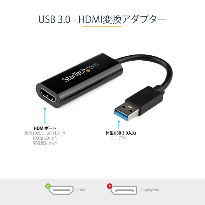 [ディスプレイアダプター]USB 3.0ポートをHDMI出力ポートに変換。1920x1200/1080p のビデオ出力に対応。 ◆ 薄型軽量設計 超軽量 SuperSpeed USB 3.0 (5 Gbps) 最大1920x1200/1080pのHD解像度に対応 USBパワード - 外付けアダプタ不要