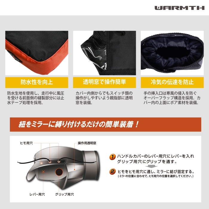 ※ブランド名 リード工業 / カラー オレンジ / 外寸 約145mm(幅)×約240mm(高さ) / 付属品 ミラー固定用紐 / 素材 防水生地[ハンドルカバー]