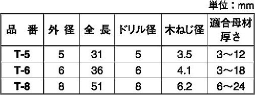※外径:5 全長:31 ドリル径:5 木ネジ径:3.5 適合母材厚さ:3〜12