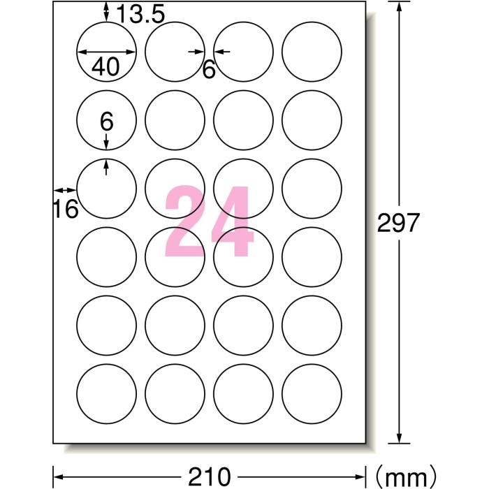 エーワン インクジェットプリンタラべル ?40mmφ表示/ステッカー用?(A4サイズ・24面・15シート) 28814◆手間のかかるステッカー・表示ラベルが手軽にキレイに作れます。◆乾きが早く、にじまないので小さな文字や線もクッキリ印刷。◆インクジェット・バブルジェット方式のパソコンプリンタやワープロに最適!シートサイズ A4サイズ(210×297mm) 面付き 24面 (4列×6段) 一片サイズ 40mmφ 入数 15シート(360片) 紙厚 125g/m2 0.15mm 紙質 塗工紙 タイプ・特性 マット・GPNデータベース掲載商品 対応プリンタ インクジェット・ドットインパクト 対応インク 顔料・染料 用途 内容物表示用