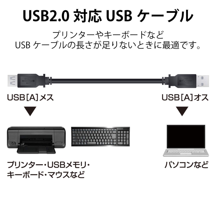 [エレコム][USBケーブル]■USB(Aタイプ:オス)のインターフェイスを持つメモリーカードリーダやマウス、キーボードなどの周辺機器のUSBケーブルを延長して接続できるUSB2.0ケーブルです。■※最大転送速度480Mbpsに対応しますが、USB2.0は規格上、延長が認められていません。■サビなどに強く信号劣化を抑える金メッキピンを採用しています。■外部ノイズの干渉から信号を保護する2重シールドケーブルを採用しています。■コネクタ形状:USB(A)オス-USB(A)メス■対応機種:USB(Aタイプ)を持つパソコン及びUSB HUB、USB仕様の周辺機器■ケーブル長:2.0m※コネクタ部分を除く■規格:USB2.0規格(HI-SPEEDモード)準拠■対応転送速度:480Mbps※USB2.0は規格上、延長が認められていません。■プラグメッキ仕様:金メッキピン■2重シールド:○■ツイストペアケーブル(通信線):○■カラー:ブラック ◆ USB2.0準拠 延長ケーブル Aタイプ
