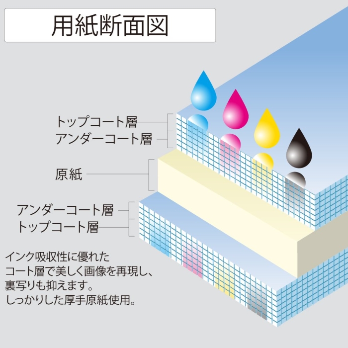 “IJP用マット紙" スーパーファイングレード 両面印刷用 厚手 (A3ノビサイズ・20枚) KJ-M25A3B-20発売年月 2009年12月下旬 型番 KJ-M25A3B-20 JANコード 4901480253794 メーカー コクヨ 色 白色度91%程度(ISO) シートサイズ A3ノビサイズ(483×329mm) 入数 20枚 紙厚 【厚手】187g/m2・0.23mm タイプ・特性 【マット】【両面印刷】 対応プリンタ インクジェットプリンタ 対応インク 顔料・染料 種類 B4・A3以上 “メニューやカード、POP、カレンダーなどの幅広い用途に対応しています。"両面のカードやカレンダーなど:コシのある厚手の両面印刷インクジェットプリンタ用紙。(A3ノビサイズ・20枚)○ 裏うつりしにくい裏うつりを抑え、高解像度の写真やグラフィック画像、文字などを美しく再現します。※ 「A3ノビ」はA3よりひとまわり大きいサイズで、出力後に四辺の余白をカットすれば、A3用紙の全面に印刷したものが作れます。