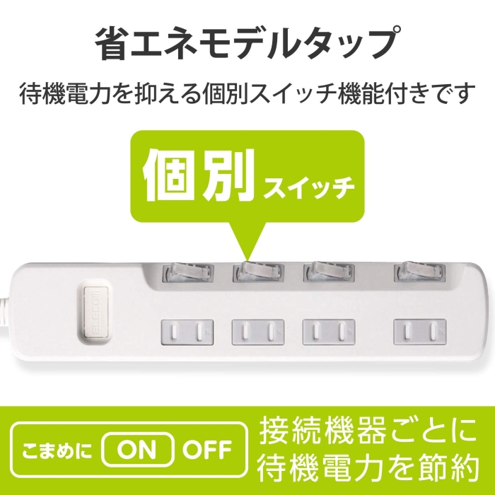 [エレコム][電源タップ]接続機器ごとにON/OFFでき、待機電力を個別に節約できる個別スイッチが付いた省エネタップです。