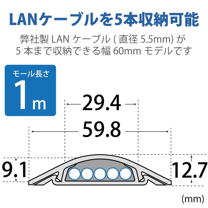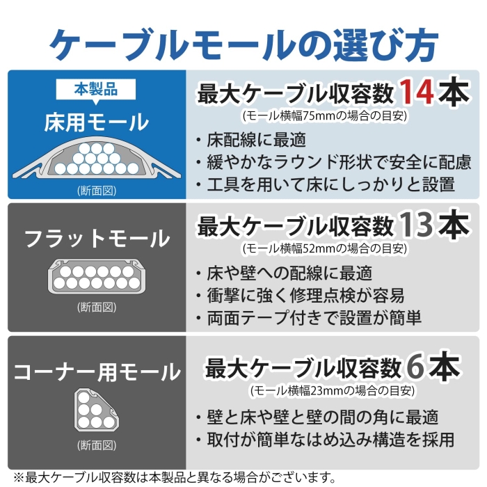 ■メーカー:エレコム■JANコード:4953103100695,型番:LD-GA1407・長さ: 1.0m ・外寸幅: 60mm ・外寸高さ: 12.5mm ・カラー:ベージュ・材質: PVC ・最大収納本数:7本○床に配線したケーブルを保護し、すっきり収納できる床用モール(ベージュ) 床に配線したLANケーブルや電源コードなどの各種ケーブルを保護し、すっきり収納できる床置きタイプのモールです。ゆるやかなラウンド形状を採用しているため、つまずいたり台車で引っ掛けたりする心配を軽減します。また、強度の高いPVC素材を採用し、床に配線したケーブルを断線などから保護。ネットワークトラブル等を未然に予防します。