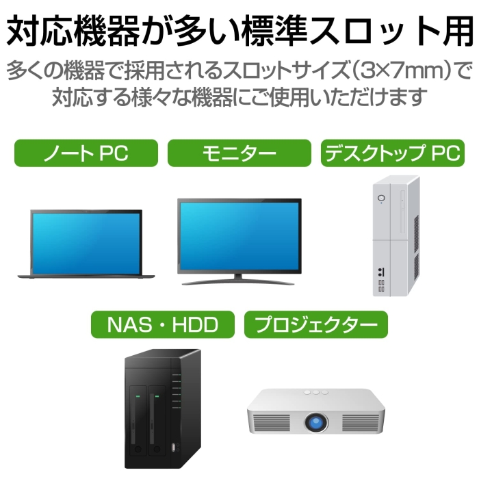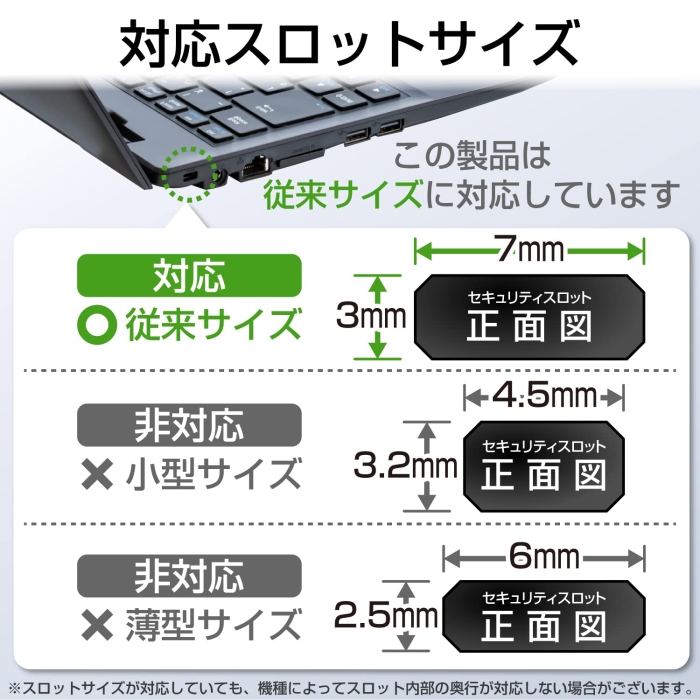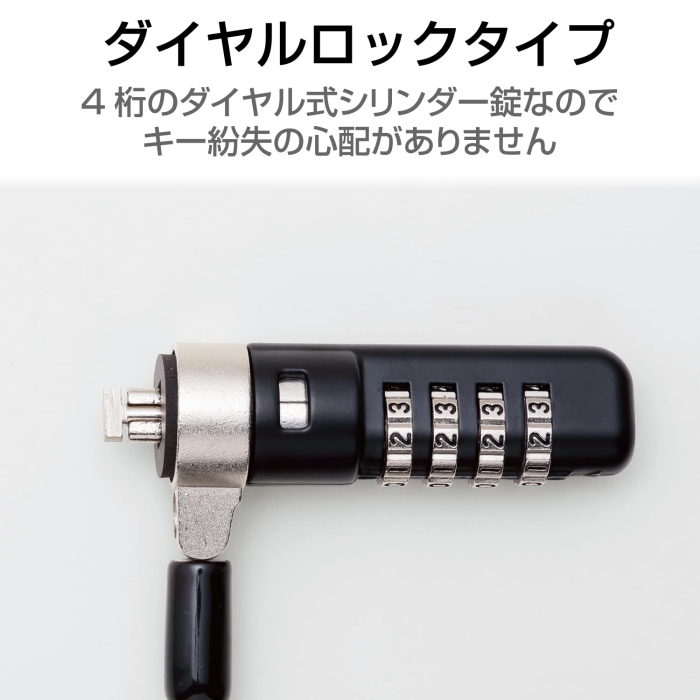 [エレコム][盗難防止用品]■セキュリティスロットに取り付けて、パソコンや液晶モニタなどを盗難から守るセキュリティワイヤーロックです。 ■一秒でロックできるキー不要の4桁ダイヤル式セキュリティワイヤーです。 ■設置状態がひと目で分かる表示窓付きです。 ■90度の首振り機能と、360度のヘッド部回転機能付です。 ■デスクなどにもキズが付かないよう、ワイヤーにはコーティングを施しています。 ■ダイヤル番号は自由に設定可能です。(出荷時は「0000」) ■ロック方法:専用スロットにセキュリティワイヤーロックを差込み本体を回転させ、4桁ダイヤル錠を回すだけでロックできます。解除はダイヤルを元に合わせ、本体を回転させれば取り外し出来ます。 ■仕様:ダイヤル錠(4桁) ■商品サイズ:本体:53.3mmx17mmx24.8mm ■材質:シリンダー:亜鉛合金 ■ワイヤー長さ:2.0m ■ワイヤー太さ:4.5mm ■重量:約134g ■パッケージ形態:ヘッダー付PE袋 ■セット内容:本体x1 ■ワイヤー材質:スチール+ソフトPVCコーティング ■セキュリティスロットサイズ:対応スロットサイズ2.9〜4mmx7〜8mm ※スロットサイズが対応していても、機種によってスロット内部の奥行が対応しない場合がございます。 ◆ セキュリティスロットに一秒でロックできる!キー不要の4桁ダイヤル錠のセキュリティワイヤー。