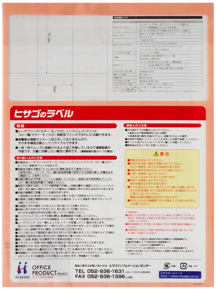 [ラベル用紙]A4タックシール24面 20シート入り ◆ A4タックシール24面。1パック:20シート入り サイズ:A4 210×297mm ラベルサイズ:74.2×35mm 紙厚:0.13mm坪量:115g/m2程度 面付け:24(4×6) 材質:上質紙。レーザー・インクジェット・コピー・熱転写。連続給紙タイプ