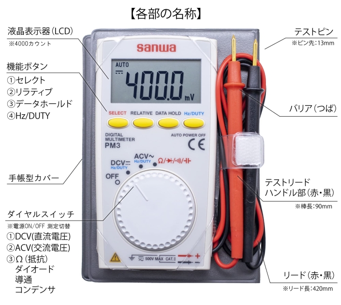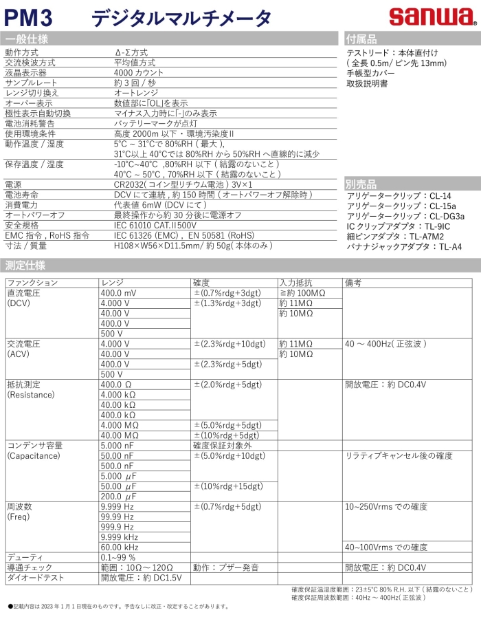 SANWA(三和電気計器) ポケット型デジタルマルチメータ PM3 2848546