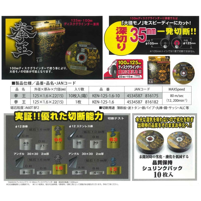 山真製鋸 切断砥石 拳王 KEN-125-1.6-10 125x1.6mm 10枚入
