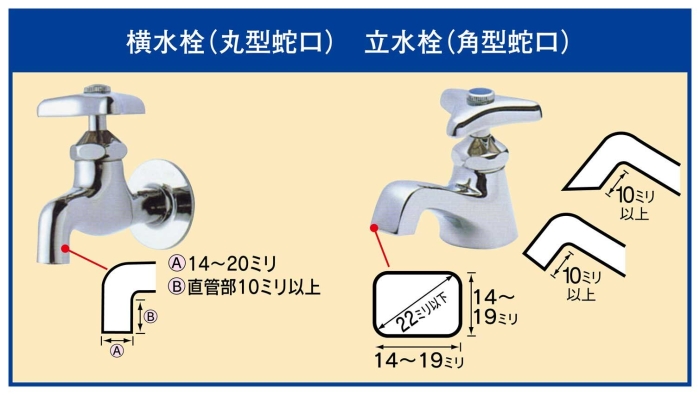 ※横水栓(丸型蛇口)、立水栓(角型蛇口)に接続できます。 蛇口径14〜20mm、直管部10mm以上に接続可能