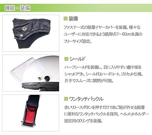 ※PSC SG 125cc以下 可動式シールド・着脱式イヤーカバーを装備したオーソドックスなビジネスモデル■ヘルメットのサイズについて:一番参考になりますのは今お持ちのヘルメットを参考にサイズをお選びいただくのが確実ですが、ヘルメットをお持ちでない場合は、以下のようにはかる方法があります。耳の上の一番出ている部分をメジャーで一周してでた数字が適合のヘルメットのサイズになります。ただし、これは一般的な頭の形状での測り方になりますのでこの測り方でもあわない恐れもございます。ご参考程度にお考えください。また、かぶり始めはサイズが合っているはずなのにきつく感じます。これはお客様の頭の形に内装が出来上がっていないためですので、使用しているうちに内装がお客様の頭の形状に合ってきます。この期間中での長時間のライディングはお控えください。■返品・交換について:サイズが合わない場合の返品・交換につきましては当社およびメーカーでは承ることができかねます。また、シールドの交換など通常店舗で行っていただけるサービスも提供することができませんので、ご理解の上お求めいただきますようお願い申し上げます。