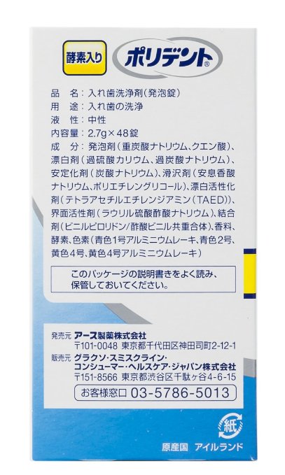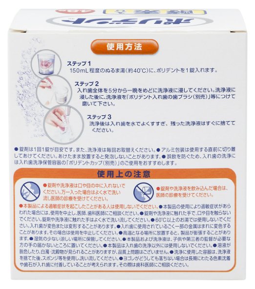 商品管理番号:4901080700117、生産地:アイルランド、サイズ:【単品サイズ】幅101×高108×奥58(mm)素材:【成分】発泡剤(重炭酸ナトリウム・クエン酸) 漂白剤(過硫酸カリウム・過炭酸ナトリウム)、注意事項:錠剤や洗浄液は口や目の中に入れないでください。万一入った場合はよく水で洗い流し医師の診療を受けてください。錠剤や洗浄液を飲み込んだ場合は、医師の診療を受けてください。本製品による過敏症状を起こしたことがある人は使用しないでください。本製品の使用により過敏症状があらわれた場合には、使用を中止し、医師・歯科医師にご相談ください。錠剤や洗浄液に触れた手で、口や目を触らないでください。錠剤や洗浄液に触れた手はよく水で洗い流してください。60°C以上のお湯では使用しないでくださ【使用上の注意】錠剤や洗浄液は口や目の中に入れないでください。万一入った場合はよく水で洗い流し医師の診療を受けてください。錠剤や洗浄液を飲み込んだ場合は、医師の診療を受けてください。本製品による過敏症状を起こしたことがある人は使用しないでください。本製品の使用により過敏症状があらわれた場合には、使用を中止し、医師・歯科医師にご相談ください。錠剤や洗浄液に触れた手で、口や目を触らないでください。錠剤や洗浄液に触れた手はよく水で洗い流してください。60°C以上のお湯では使用しないでくださ【保管及び取り扱い上の注意】ヨゴレがどうしても落ちない場合は長期にわたる色素沈着や歯石が入れ歯に付着していることが考えられます。その際は歯科医師にご相談ください。【問合せ先】グラクソ・スミスクライン株式会社〒151-8766東京都渋谷区千駄ヶ谷4-6-15お客様窓口03-5786-5013